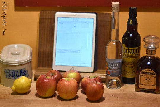 “To 6 apples well roasted, with the peel on (while hot pass through a colander) add a half pint of French brandy a gill of Jamaica spirits, a gill Peach brandy, and let it stand 4 hours covered closely, then add 1 qt of boiling water made very sweet with loaf sugar, if you add a few pieces lemon rind to the Brandy, take it out when you add the Water.”